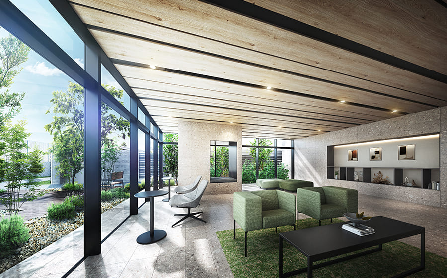 縦と横のラインを強調し、内壁をグレーとすることで立体感を出しながら、地域に寄り添う落ち着きのある色彩と上品さをコンセプトとして計画。「リビオシティ小倉中井イーストコート」との連続性を持たせつつ、新たな価値を与えることにこだわりました。