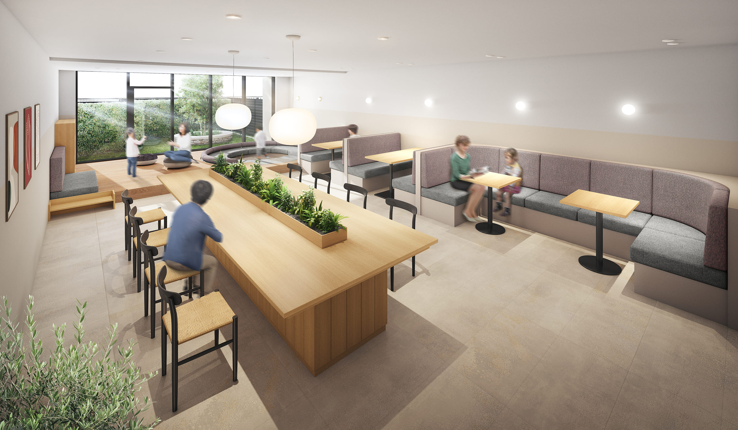 小さなお子さまと過ごせるスペース。ハンモックやベンチに座ってお子さまを見守ることができ、ライブラリーには定期的に入れ替える世界の絵本がセレクトされています。