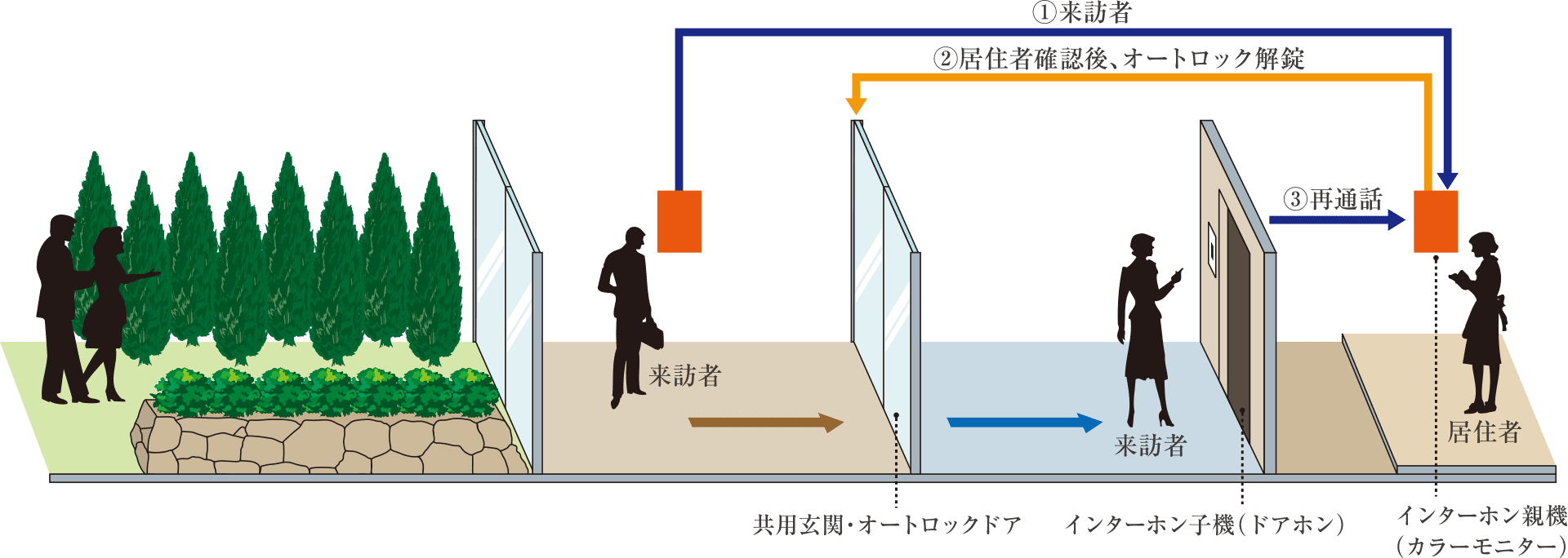 来訪者を音声とカラーモニターによる映像で確認した後、解錠するオートロックシステムを採用。マンションへの不審者の侵入を防ぎます。