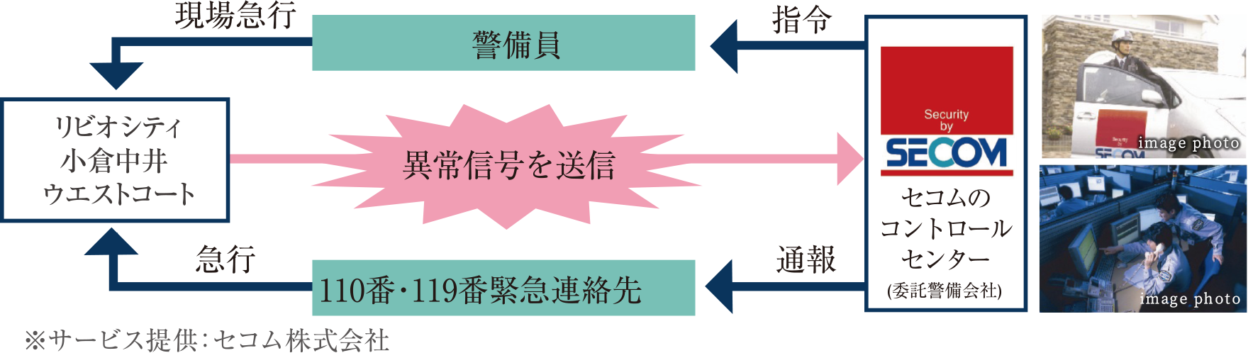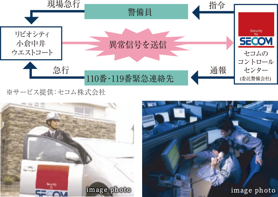 居住者の安全を守るための機能を備えた24時間体制のセキュリティシステムを導入。異常が発生した場合は、その情報をセコムのコントロールセンターが受信。