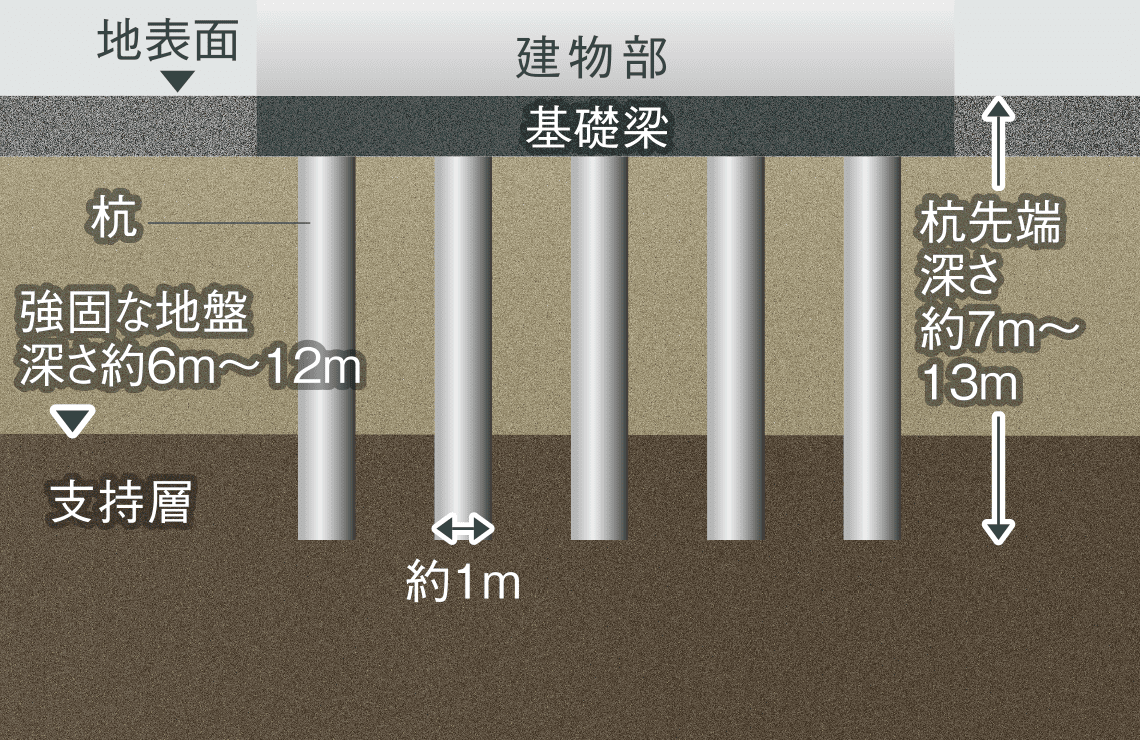 建物基礎は、強固な地盤の支持層にまでコンクリート杭を打ち込んでいます。地下約7m~13mまで打ち込んだ54本の杭が建物全体を支えていきます。