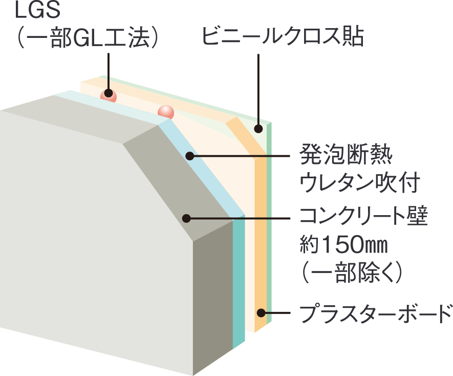 外部に面する躯体コンクリート壁厚は約150mmを確保しています。また、発泡ウレタンを吹き付けることで断熱性をさらに高めています。