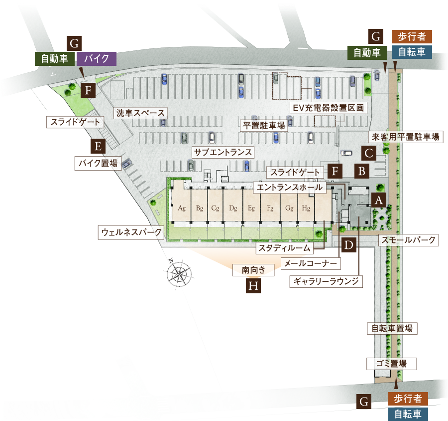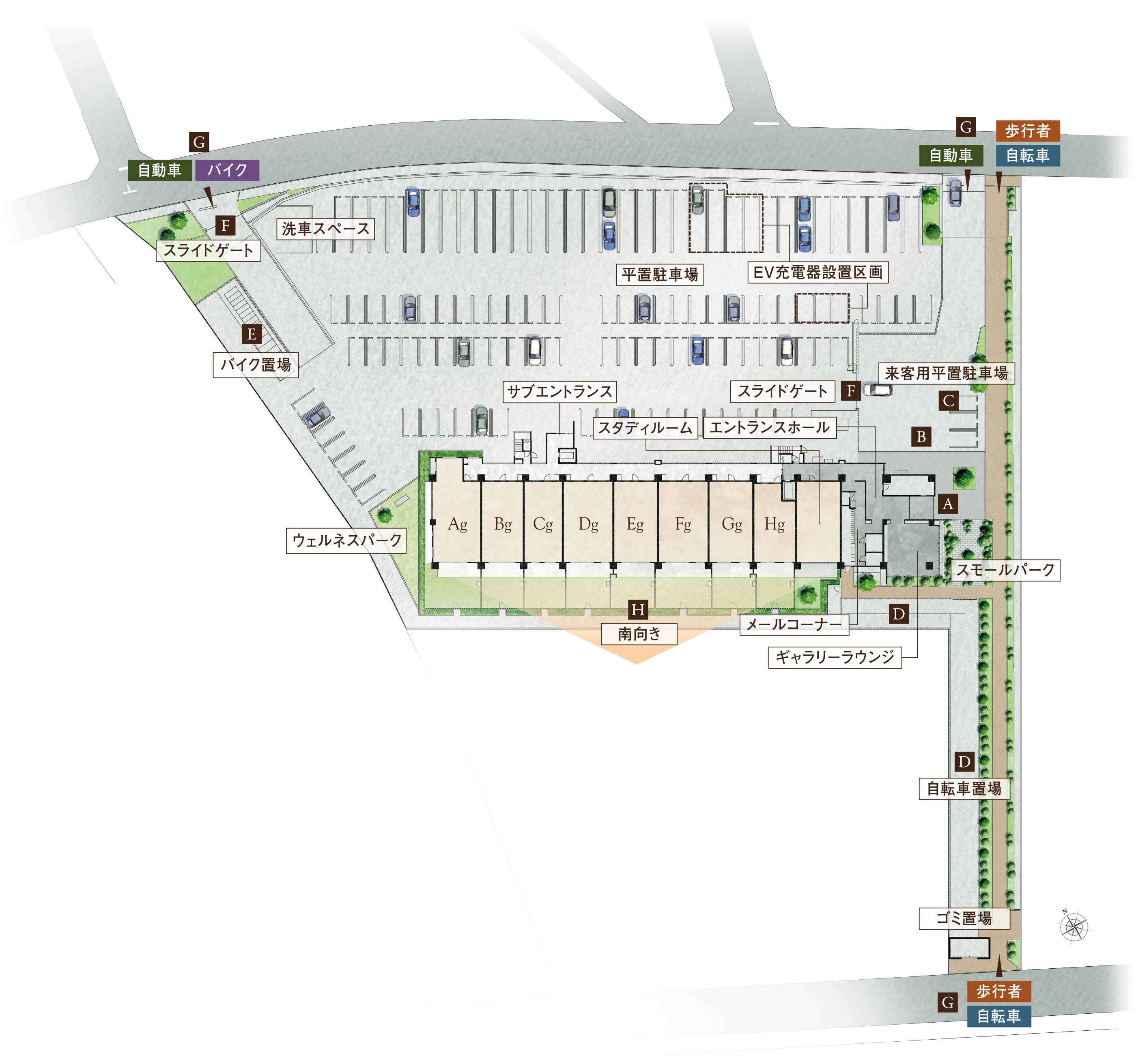 歩行者と車・バイクの進入路を分けた歩車分離動線で、安全で安心な暮らしに配慮。