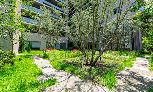 敷地の南北に伸びる歩道から進入するアプローチは、豊かな植栽が彩ります。